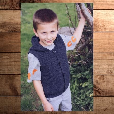 A boys textured buttoned vest with a plain hood and a pocket, a perfect layer for a treasure hunter out for an adventure.