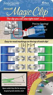 Magic Clips™ are the only sewing clips that can safely go under the sewing machine foot only requiring an 1/8” of clearance from the needle. This eliminates the need to pause and remove them while stitching. Unlike other bulkier clips with curved bodies, Taylor Seville Magic Clips™ have flat, stainless steel prongs and comfortable handles that don’t interfere with sewing. They come with clear markings for 1/4”, 1/2” and 5/8”.