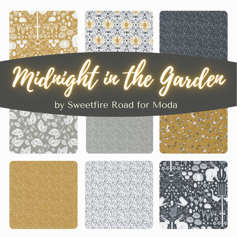 Sweetfire Road and Moda fabrics invite you to spend Midnight in the Garden, "where the sun sets over a cottage garden, the bright day's sky slowly turns to the soft blush and gold shades of twilight. The night air is scented with fresh earth, ripe berries and sweet apples and, as midnight arrives, the garden is transformed into a strikingly beautiful stillness colored in shades of charcoal and moonlight."Â Â