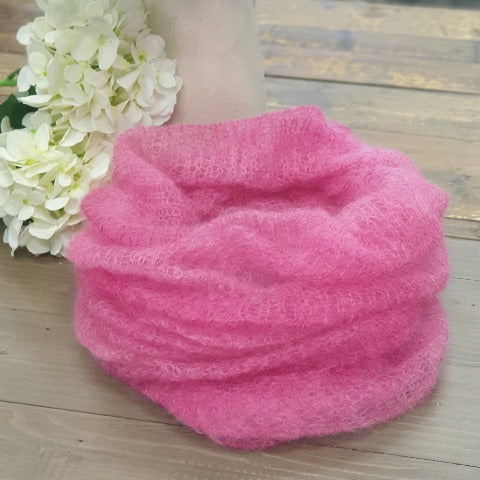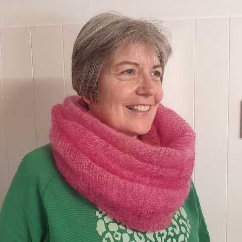 Like a cosy cloud of warmth, this cowl is surprisingly warm for how lightweight it is. Super easy to make, it only takes one 50gm ball of Mohair