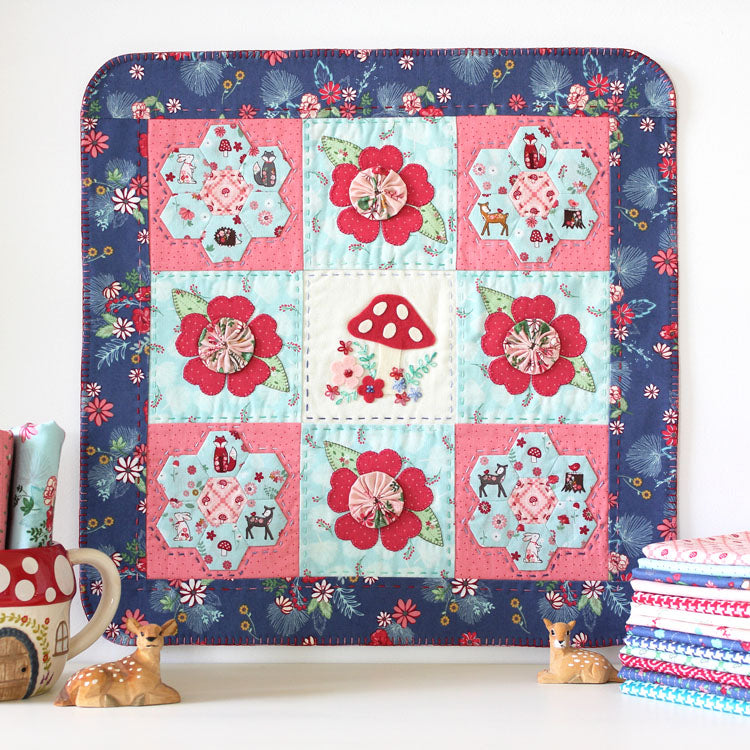 This step-by-step pattern helps you create nine individual mini quilt blocks that include hand embroidery, working with felt, English Paper Piecing with hexagons, raw edge fabric appliqué and yoyo or Suffolk puff sewing.