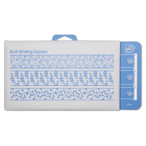 Create perfect quilt binding quickly and accurately. Begin with 2″, 2-1/4″ or 2-1/2″ strips of fabric. Fold end of strip in half to feed through the appropriate size slot as marked. Fabric strip automatically folds in half as it is pulled through the slot. Iron folded strip on pressing surface using corresponding guidelines.