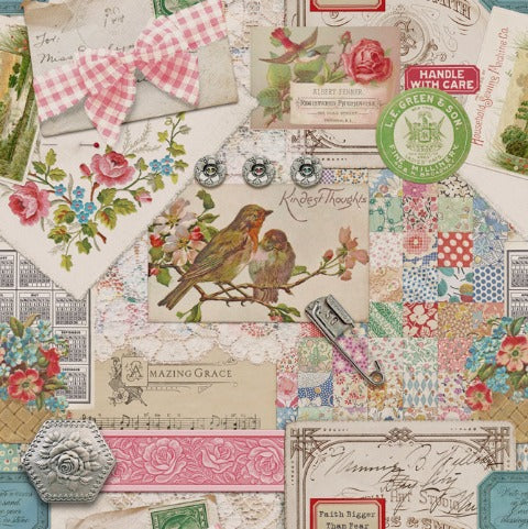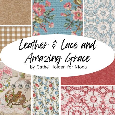 Leather & Lace & Amazing Grace, designed by Cathe Holden for Moda Fabrics, features pretty florals, sweet ginghams, vintage needlework, and journal collage and has been designed to shine a beautiful light on those who journey through the most difficult experiences, and to the beautiful souls who carry us through.
