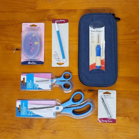 Ideal for new sewers or kids - affordable items, acceptable quality. The kit contains pins, seam ripper, Magnetic pincushion, Fabric Marker, Bodkins and 2 sizes of scissors and a organiser pouch.